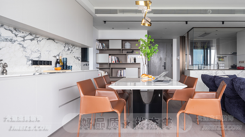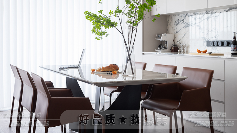 燈光的設(shè)計(jì)也是廚房與餐廳設(shè)計(jì)中不可忽視的部分。在這個(gè)廚房與餐廳中,大連杰美裝修裝飾設(shè)計(jì)師運(yùn)用了吊燈、壁燈和臺(tái)燈等不同類(lèi)型的燈具,創(chuàng)造出了豐富而舒適的光環(huán)境。吊燈可以提供明亮而集中的光線(xiàn),用于照亮需要重點(diǎn)照明的地方,如餐桌和廚房操作臺(tái)等。壁燈則可以提供柔和而均勻的光線(xiàn),用于照亮整個(gè)空間。臺(tái)燈則可以提供明亮通透的光線(xiàn),用于創(chuàng)造舒適和溫馨的氛圍。
