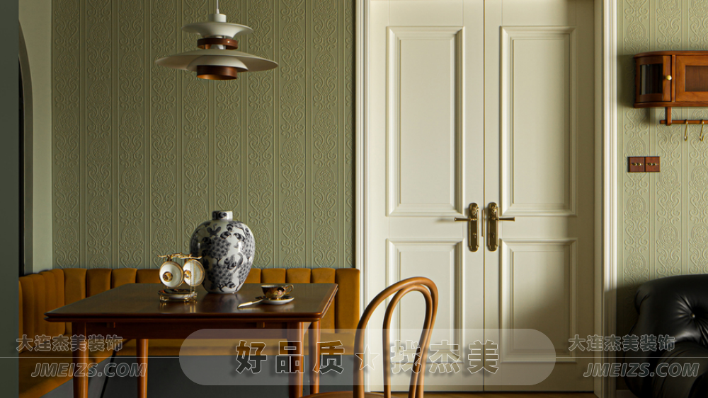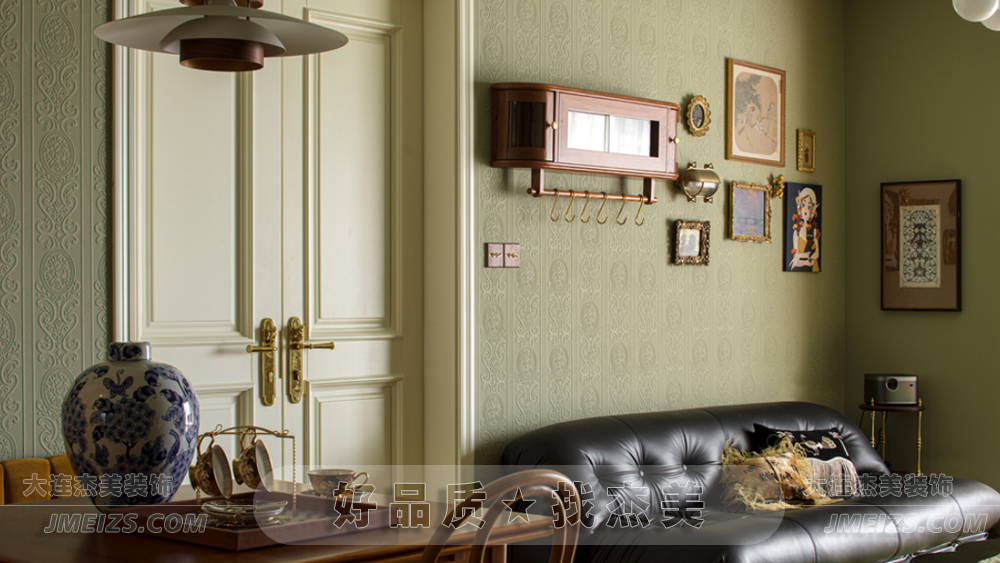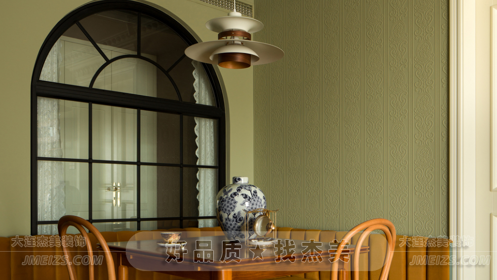 本案在設(shè)計風格上,我們杰美裝飾設(shè)計師融合了王家衛(wèi)電影的藝術(shù)美感和復古氛圍。線條雕塑、壁紙和海吉布被用來覆蓋原始墻面,保留了墻體的本真,卻減少了痕跡的顯露。