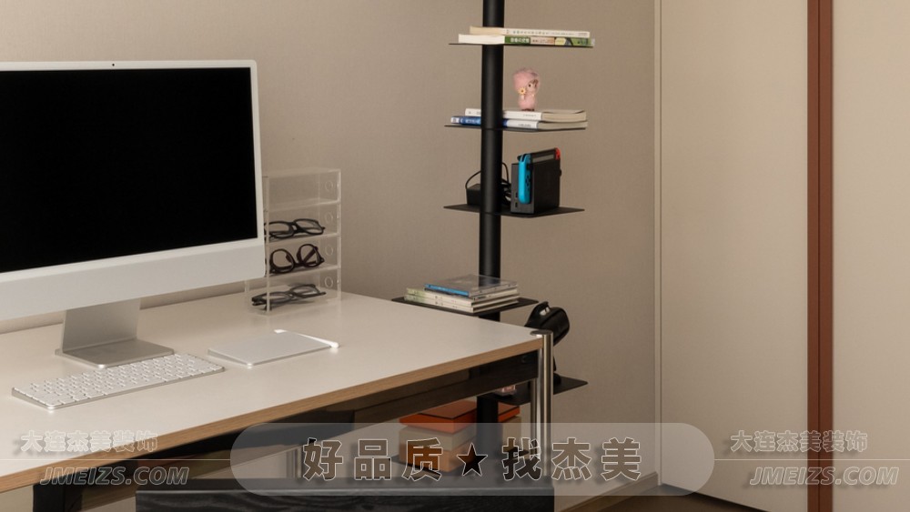書房采用簡單的陳設(shè)滿足基礎(chǔ)需求,營造寧靜和安逸的氛圍。墻面打造了一個頂天立地的收納柜,柜門與墻面同色,視覺上融為一體。同時點綴著簡約的木條裝飾,豐富了空間的層次感。