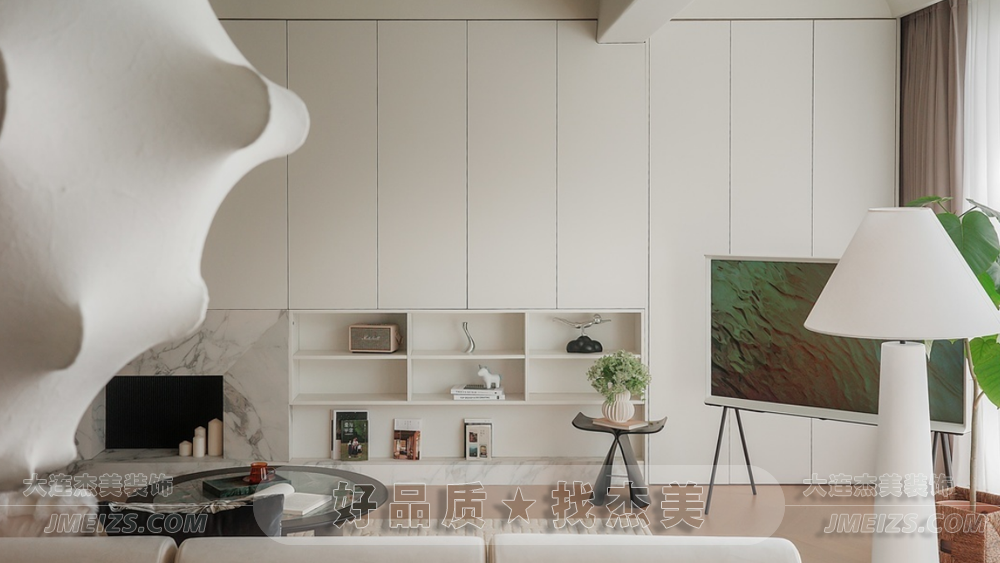 電視柜背景墻設(shè)計為2.76米到頂?shù)氖占{柜,隱藏儲物空間同時滿足日常收納需求。一旁的置物架上擺放著居者收藏的來自世界各地的美物,設(shè)計兼顧了功能性和美觀性。