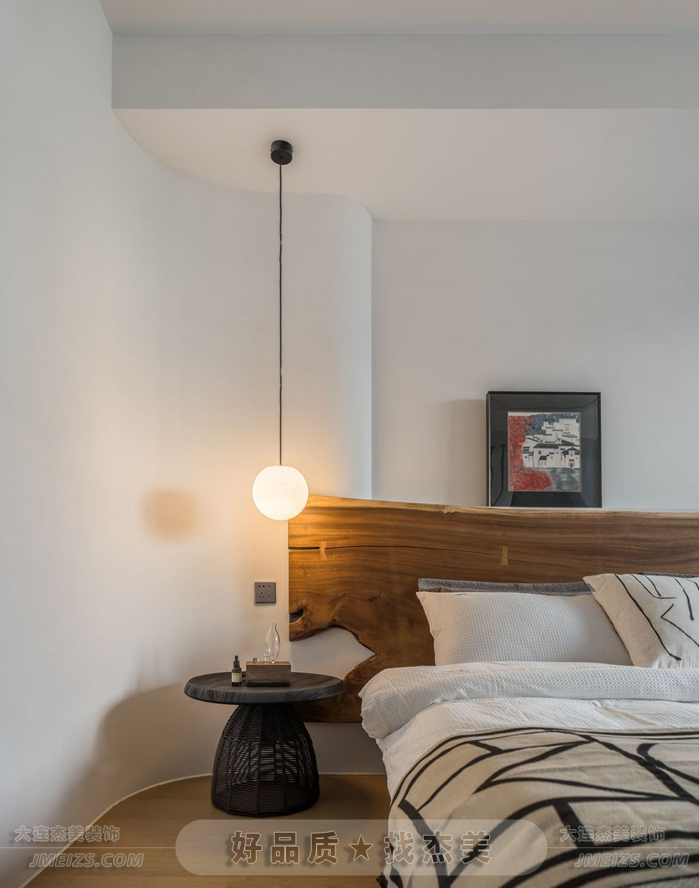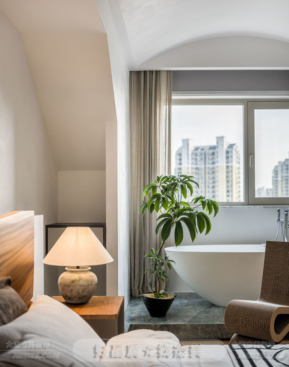 主臥設(shè)計(jì)給人一種寧?kù)o自然的感覺(jué)。床頭采用了原生態(tài)的實(shí)木,懸浮的床架設(shè)計(jì)非常特別。此外,浴缸也被設(shè)計(jì)在主臥內(nèi),增加了空間的多功能性。