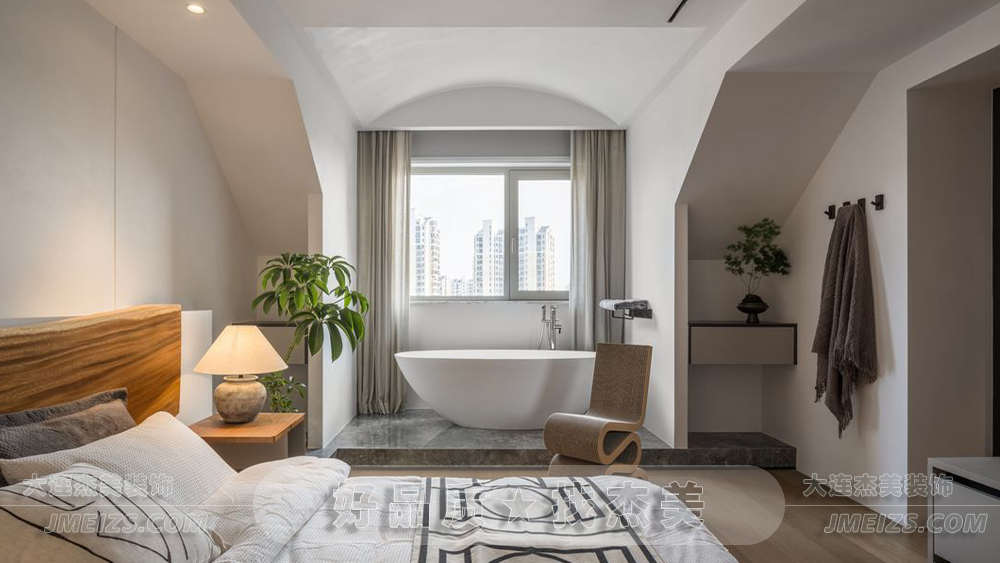 主臥的設(shè)計(jì)注重了空間的私密性和多功能性。原生態(tài)的實(shí)木床頭和懸浮床架的設(shè)計(jì)都體現(xiàn)了對(duì)自然和簡(jiǎn)約美學(xué)的追求。浴缸的設(shè)置則是一種生活方式的體現(xiàn),它不僅滿足了居住者的基本需求,還增加了空間的趣味性和功能性。