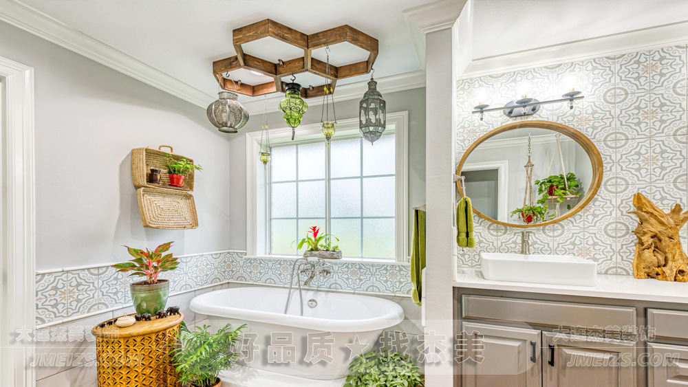 浴室里的自由立式浴缸顯得格外引人注目,它的經(jīng)典設(shè)計(jì)和純白色澤讓人聯(lián)想到古典歐洲的優(yōu)雅。四周環(huán)繞的植物與天然材質(zhì)的裝飾品,如同畫(huà)布上生動(dòng)的色彩點(diǎn)綴,為這個(gè)空間增添了生機(jī)和活力。懸掛的彩色玻璃燈具散發(fā)著柔和的光線,映射出浴室的每一個(gè)角落,仿佛在敘述著遙遠(yuǎn)國(guó)度的故事。