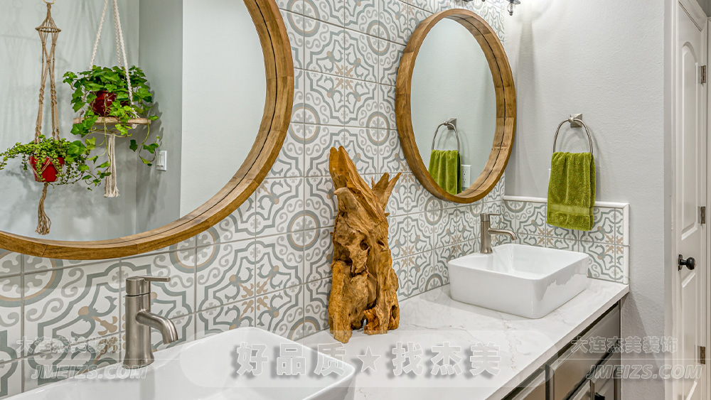 設(shè)計(jì)師運(yùn)用了獨(dú)特的墻面瓷磚,它們的圖案復(fù)古而精致,與現(xiàn)代簡(jiǎn)潔的線條和白色的洗手盆形成對(duì)比,展示了傳統(tǒng)與現(xiàn)代元素的完美融合。木質(zhì)的鏡框和天然的裝飾物品,如同大自然的饋贈(zèng),增添了一份純粹與自然的美。
