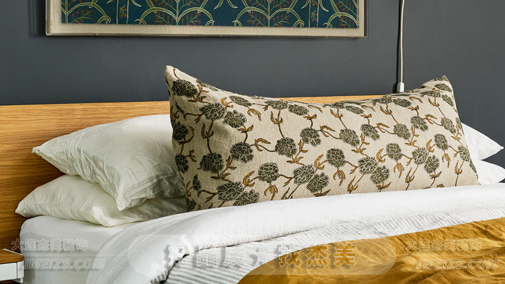 床鋪上,米白色的床品和繡花長枕承載著細(xì)膩的生活感,