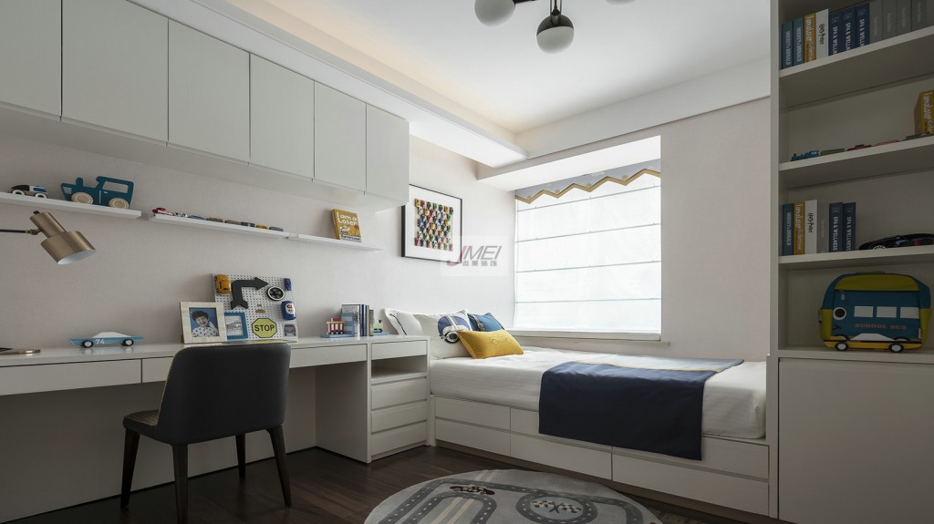 切莫忘記最初的本真,更不能忘卻流淌在血脈里那靈動(dòng)的童趣。男孩房的設(shè)計(jì)相較之下俏皮了許多,布局雖一貫以白色為主調(diào),然而黃藍(lán)搭配的巧妙點(diǎn)綴,瞬間使整個(gè)空間活躍起來。圖書靜靜擺放,汽車模型栩栩如生,紐扣小巧玲瓏,牛仔元素盡顯活力……