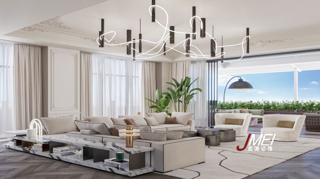 客廳與陽臺巧妙連接,視線瞬間變得一覽無余,仿佛一幅宏大的畫卷在眼前徐徐展開。這種設(shè)計,無形中極大地增加了空間感,讓整個區(qū)域顯得格外開闊大氣。再看那家具錯落有致地擺放著,而占據(jù) C 位的,當(dāng)屬那極具輕奢感的北歐異形燈,瞬間成為全場焦點(diǎn),令人一眼難忘!